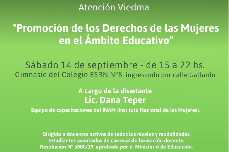 Se encuentran abiertas las inscripciones para el curso sobre promoción de los derechos de las mujeres en el ámbito educativo, que tendrá lugar en Viedma, este sábado 14, de 15 a 22.